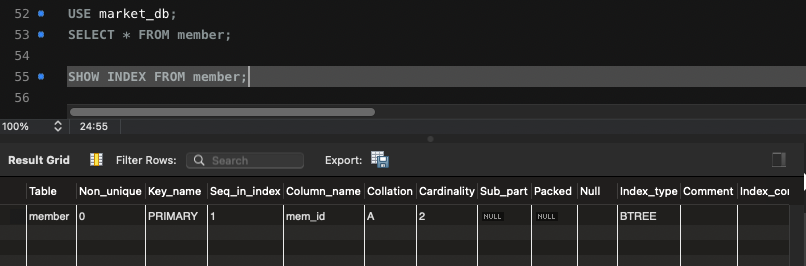 p.310 인덱스 생성하고 key_name이 PRIMARY로 출력된 결과 화면 캡처하기
