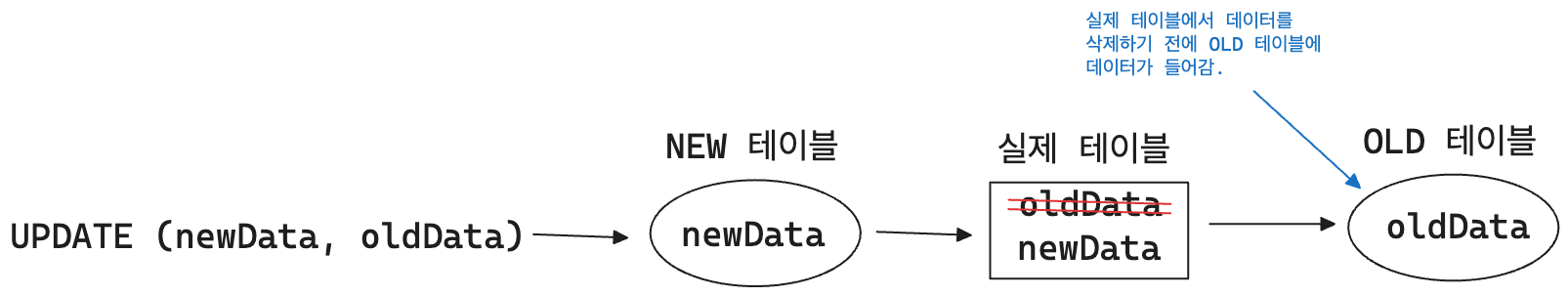 UPDATE하기 위한 새로운 값은 NEW 테이블에 저장이 되고, 실제 테이블에서는 예전 값을 삭제하고 새 값으로 교체한다. 실제 테이블에서 예전 값이 삭제되기 전 OLD 테이블에 예전 값을 저장하는 방식으로 진행된다.