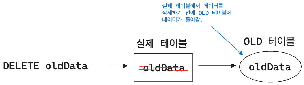 바로 OLD 테이블 덕분이다. 데이터가 만약 삭제된다면 삭제되는 데이터는 삭제되기 전 OLD 테이블에 저장된다. 그래서 우리가 DELETE시 OLD 테이블에 데이터를 꺼내서 사용하는 것이다.