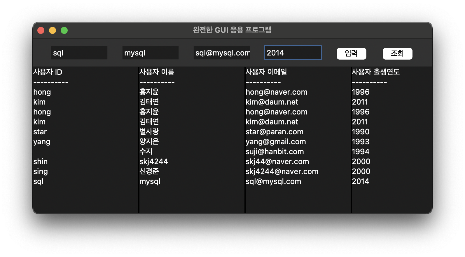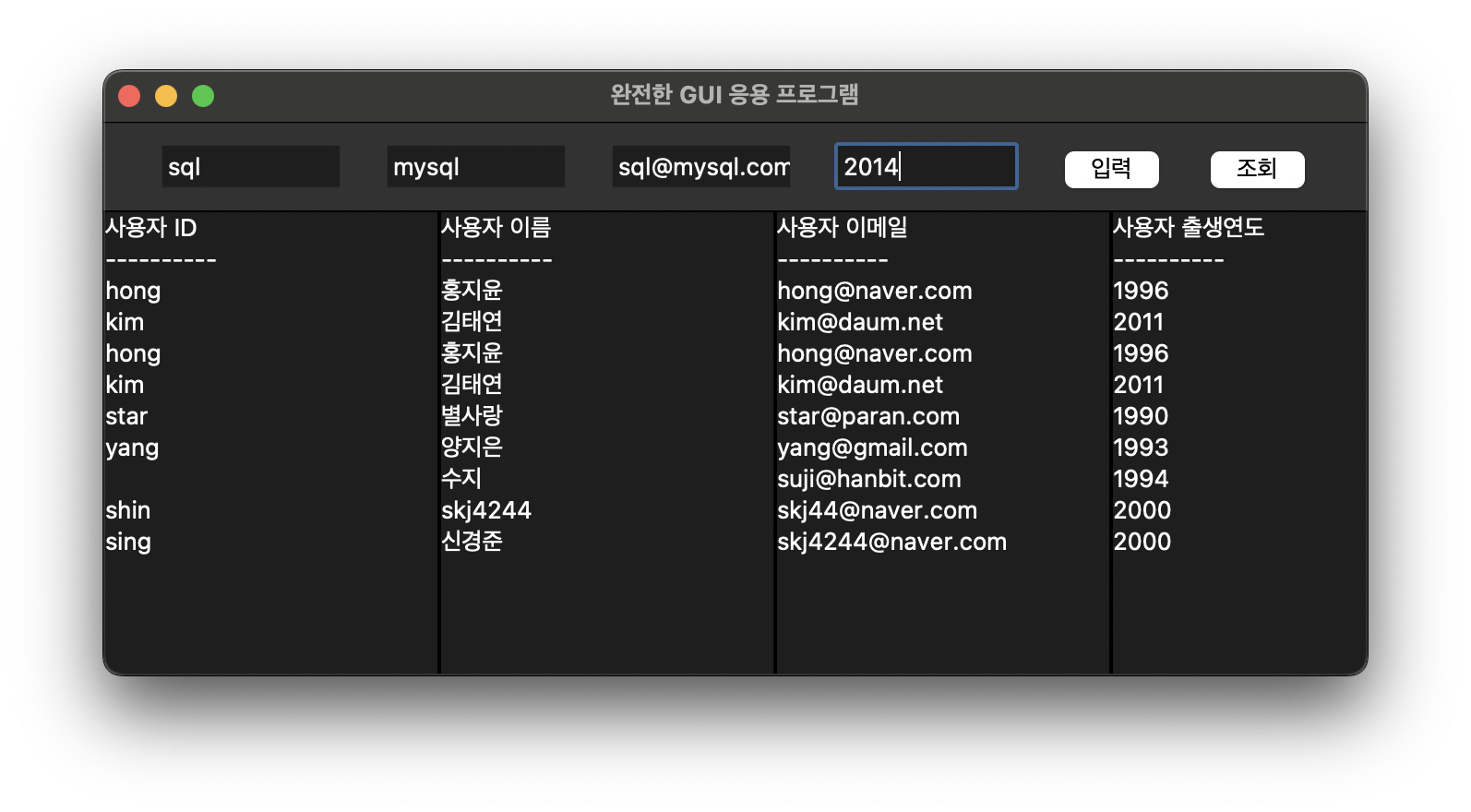 이러한 팝업창이 뜨고, OK를 누른 뒤 다시 조회 버튼을 누르면 아래와 같이 정상적으로 데이터가 입력됨을 볼 수 있었습니다.