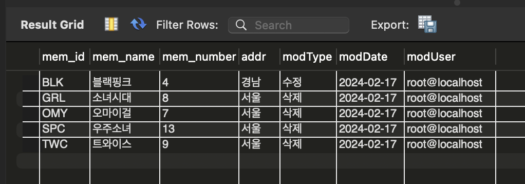 modType CHAR(2), -- 변경된 타입. '수정' or '삭제'