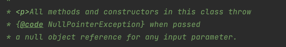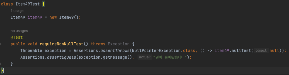 만약 requireNonNull의 검사 대상인 객체가 null이라면 NullPointerException을 던진다. 또한 예외 메세지도 직접 정할 수 있어 유연한 메서드이다.