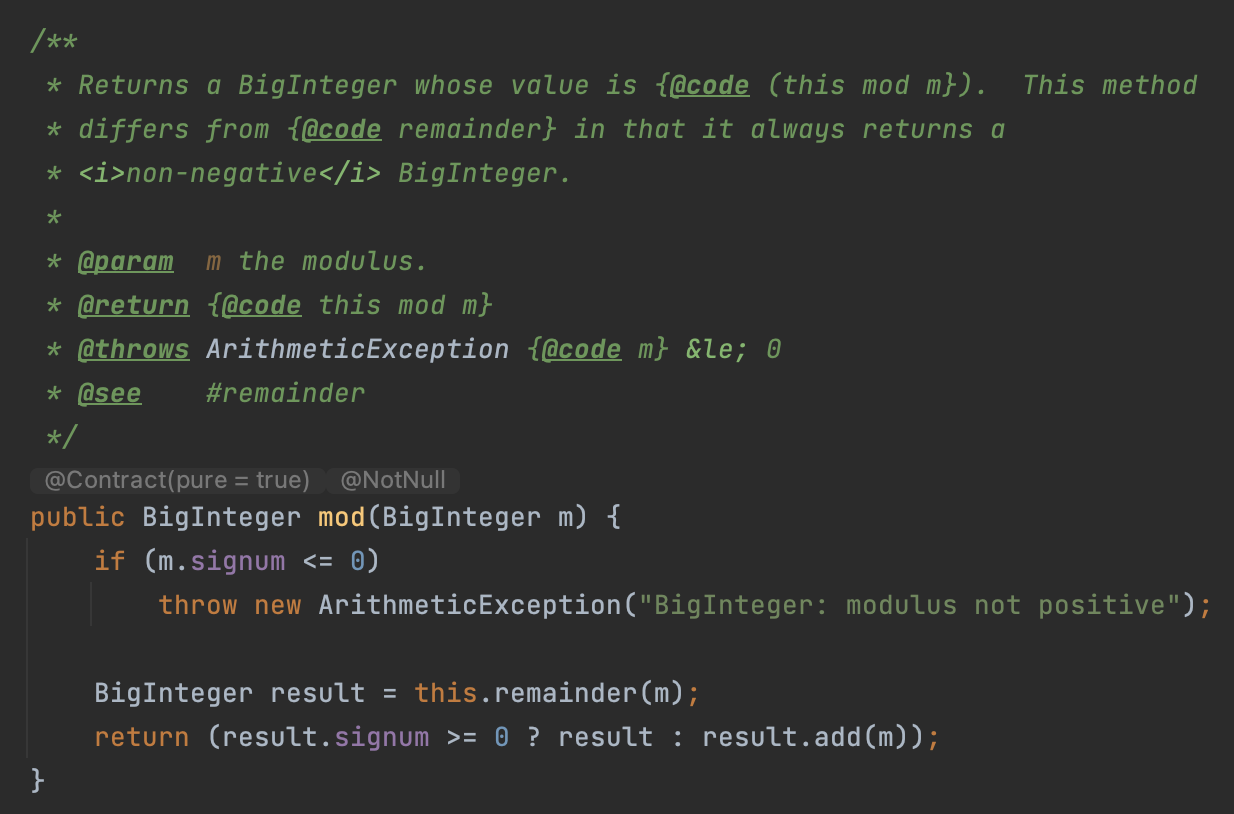 아래의 예를 확인해보자. 아래의 예는 java.math.BigInteger 클래스 내의 mod() 메서드이다.