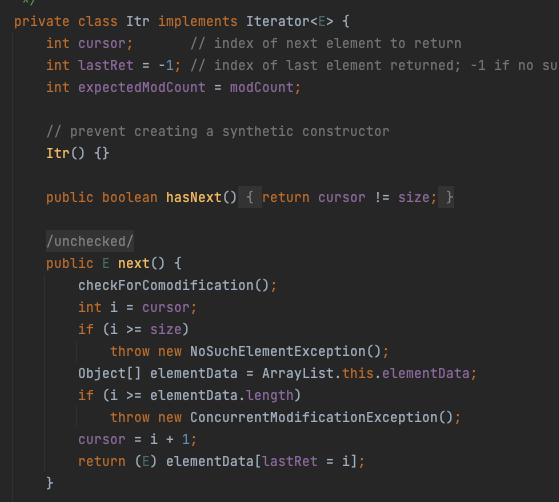 실제로 ArrayList의 Iterator를 구현한 내부 클래스인 Itr을 살펴보았다.
