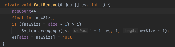 ArrayList의 remove는 파고파고 들어가 fastRemove()를 호출한다.