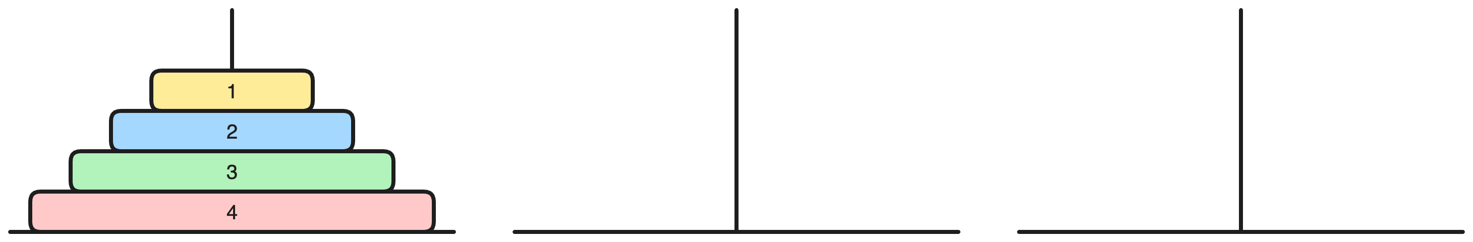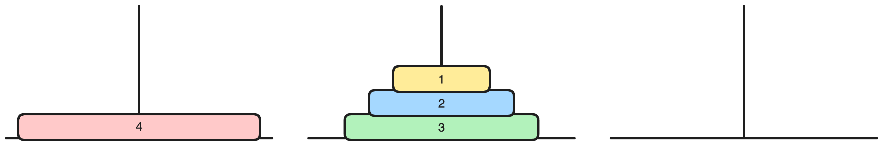 세 개의 장대가 있고 첫 번째 장대에는 반경이 서로 다른 n개의 원판이 쌓여 있다. 각 원판은 반경이 큰 순서대로 쌓여있다. 이제 수도승들이 다음 규칙에 따라 첫 번째 장대에서 세 번째 장대로 옮기려 한다.