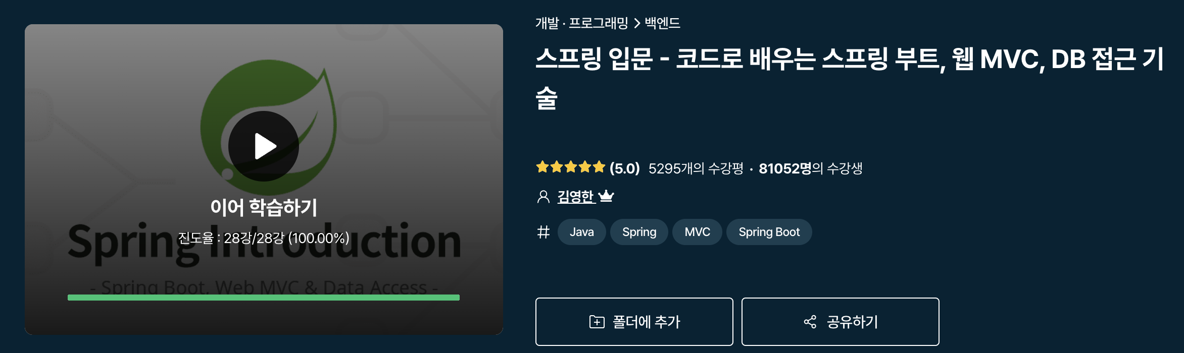 두 번째 계획은 자바 스프링 강의 듣기 입니다!! 1주차에 들었던, 스프링 입문 강의를 완강하였습니다. 또한 조금 앞서나가 스프링 핵심원리 -기본편을 수강 중에 있습니다.