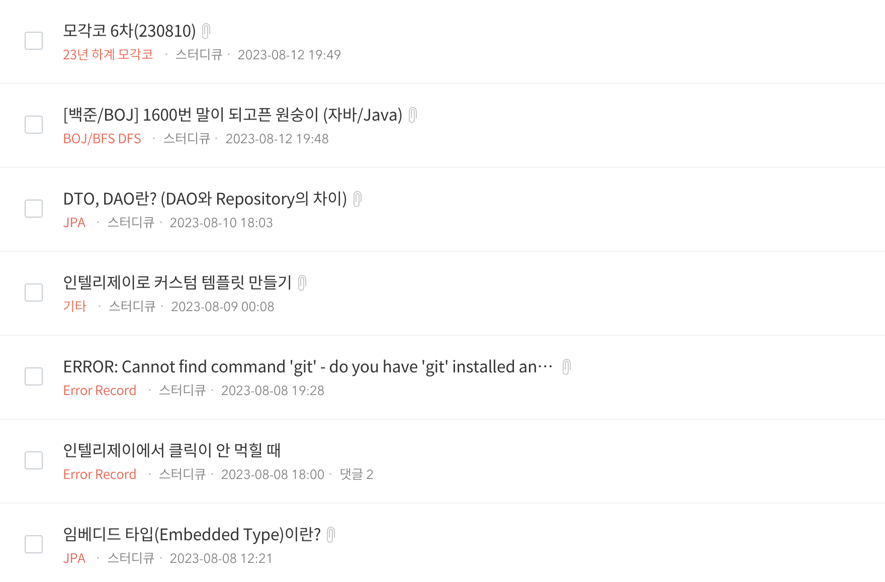 다음은 블로그 글 쓰기입니다. 현재 조금 더 진행한 JPA 부분을 다루는 글도 몇가지 작성하였습니다. 스프링 핵심원리에 대한 글은 이전에 노션에 기록하면서 다루었고, 다음주부터는 JPA에 관한 강의를 듣기 위해서 미리 예습한 글들을 작성하였습니다. 또한 진행 중인 프로젝트에서 생긴 오류나 알게된 사실을 다루는 글을 포스팅하였습니다.