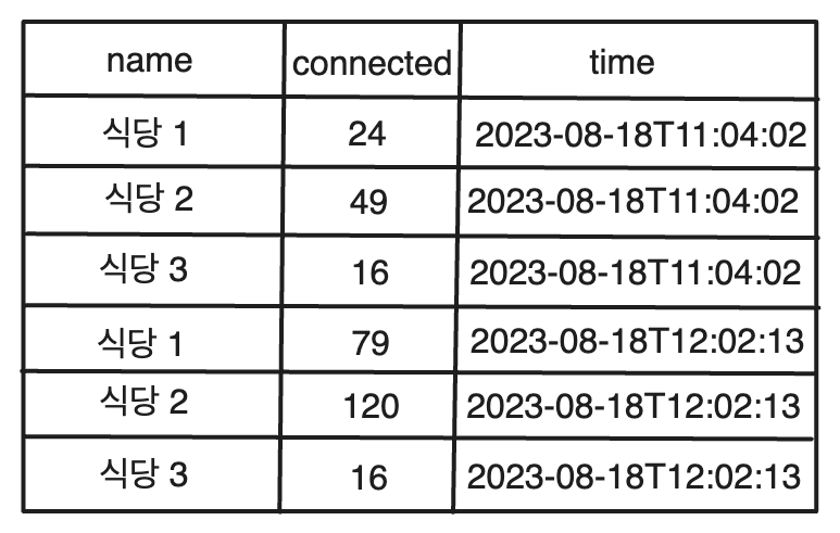 예를 들면, 아래와 같은 DB가 있다고 해봅시다. 이 DB에서는 일정 시간마다 모든 식당의 현재 인원을 받아온다고 가정합니다.